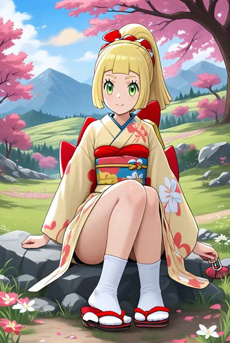 nylillie, def_colors, ponytail, blonde_hair, hair_flower, white_flower, red_flower, green_eyes, japanese_clothes, obi, yellow_kimono, sash, wide_sleevees, floral_print, tabi, white_socks, sandals, pink_footwear, red_footwear