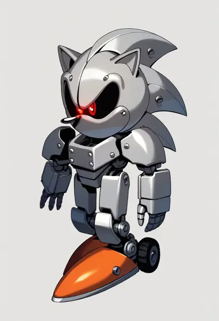 | Trained Words | MechaMk1, 1boy, no humans, robot, mecha, robotic version of Sonic, bulky silver gray exoskeleton, bright orange feet, single glowing eye, several rotating blades on the back of head heavily armored body, blocky silver gray exterior while the black endoskeleton is visible from the back, red eye, black sclera, colored sclera,Copied! |