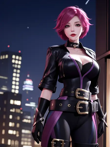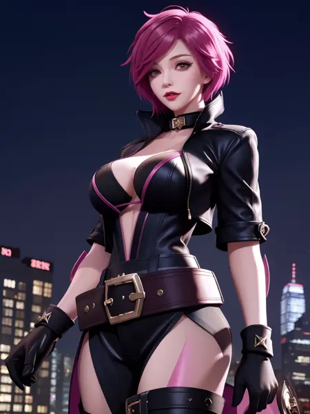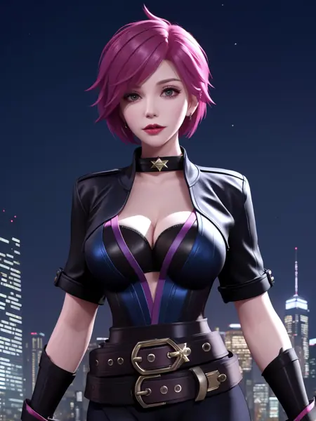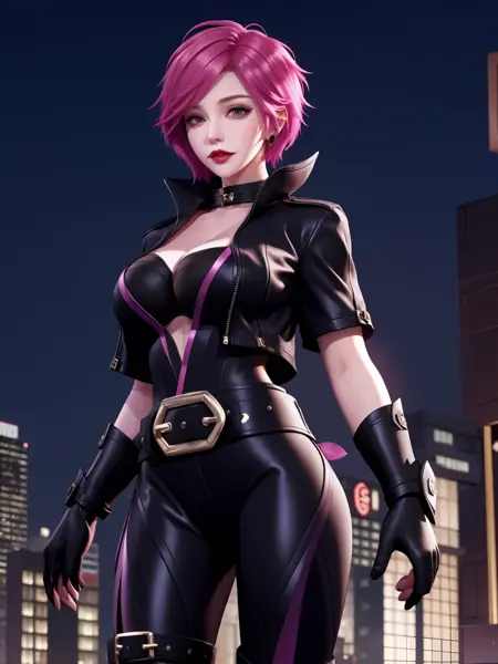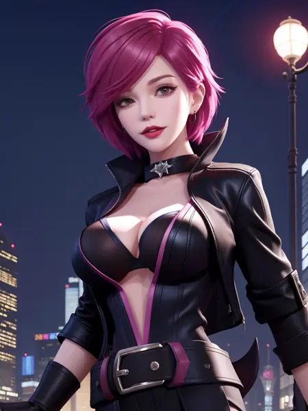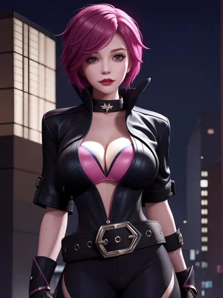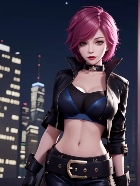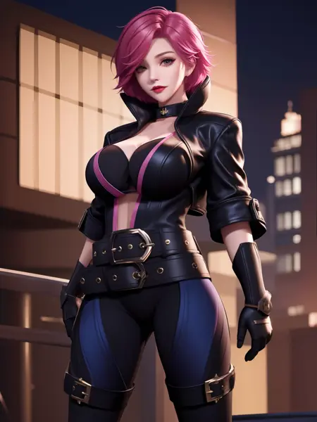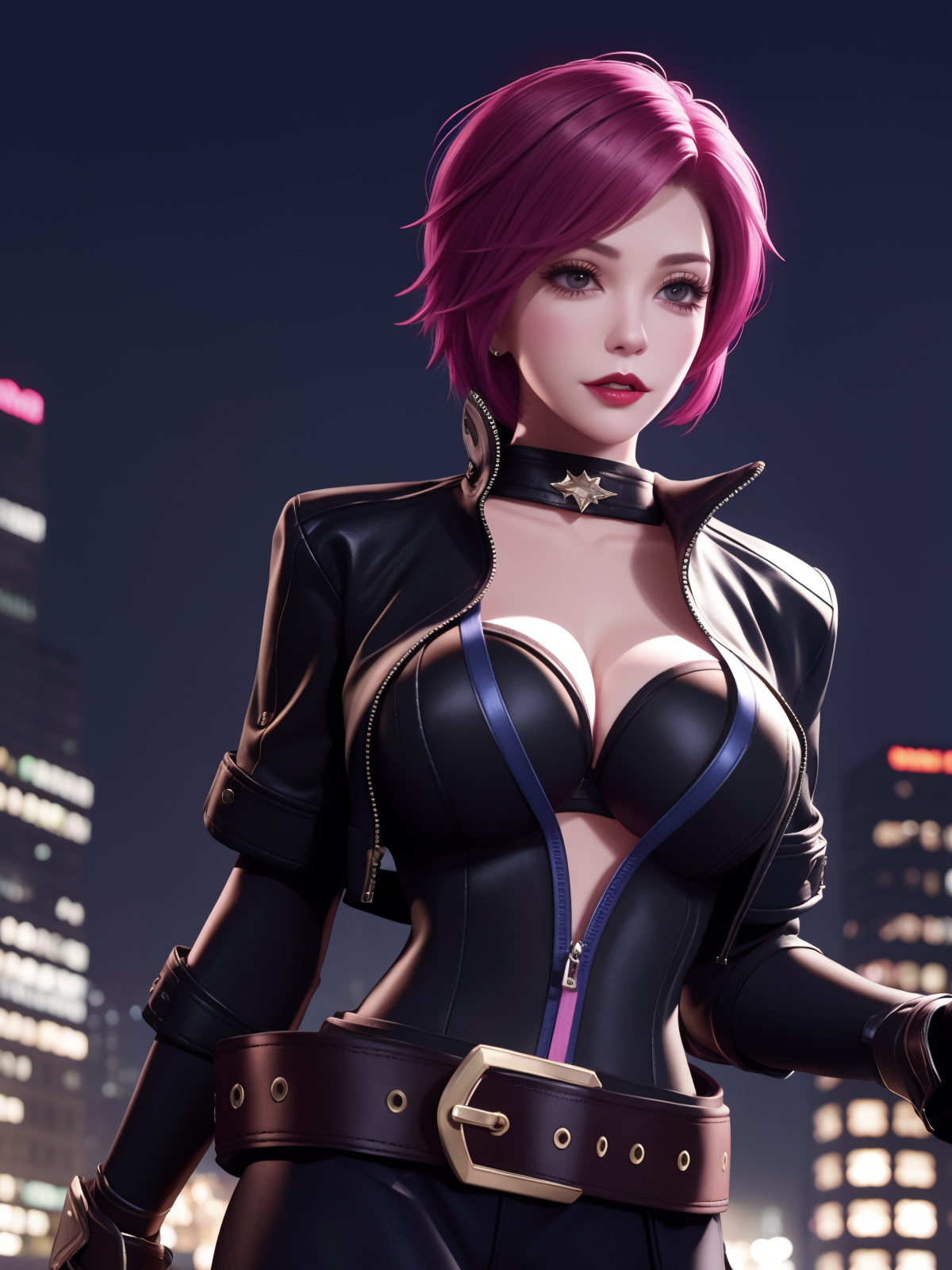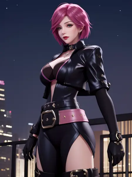 - 1girl, 성숙한 여자, 도시 풍경, 야경, 시청자 바라보기, 단발, 벨트, 장갑, 검정 재킷, 열린 옷, 단팔, 검정 바지, 갈색 벨트, 분홍색 머리, 가죽, 총알 목걸이, 진한 파란색 브라,