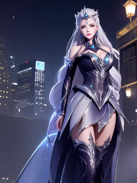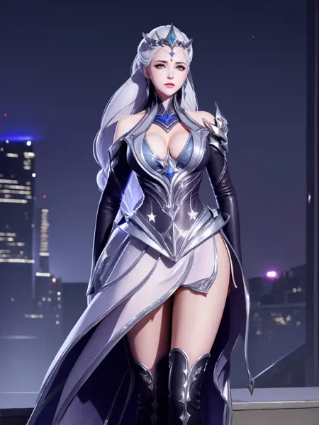 - WZRYlunaYP, 1girl, solo,long hair,white hair, cleavage,blue eyes, jewelry, looking at viewer,dress, clothing cutout, earrings, bare shoulders,armor, elbow gloves,hair ornament,boots, cityscape, night, poolside, cowboy shot,hand on hip,