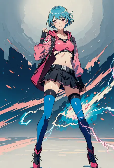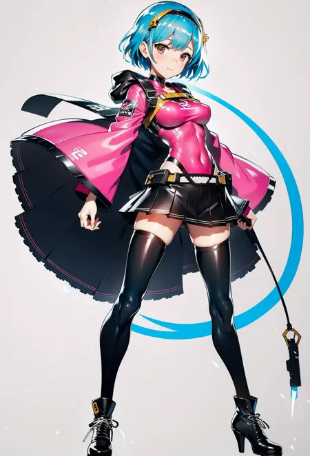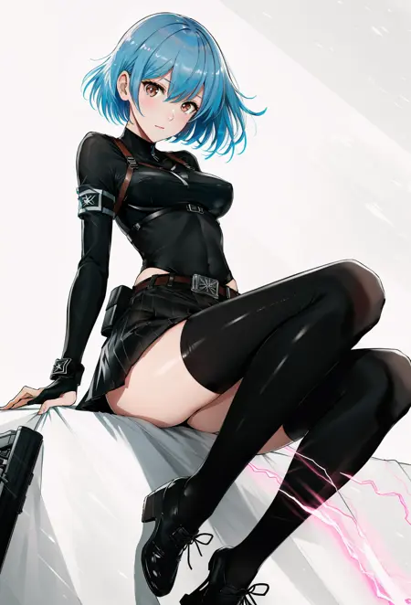 sssr,((masterpiece)),((best quality)),8k,high detailed,ultra-detailed, 1girl, full body, standing, pink eyes,solo, looking at viewer,short hair,blue hair, closed mouth, skirt, medium breasts, black gloves, pleated skirt, belt, High-heeled shoes, skin tight,sling, taut clothes, ar-15 ,Electric arc, lora:sssrV5:0.8 부정적 프롬프트: sit, (worst quality:2), (low quality:2), (bad-hands-5:1.2), bad-artist-anime, baddream, ng_deepnegative_v1_75t