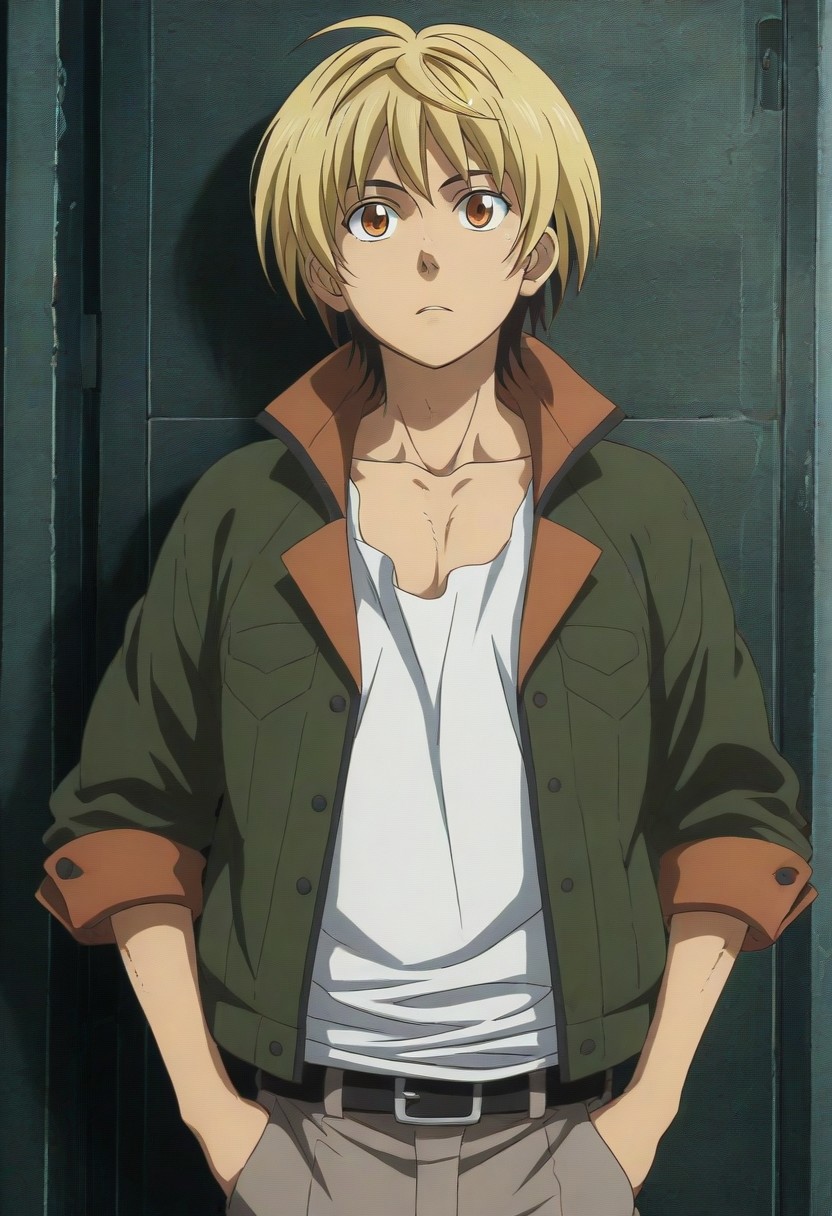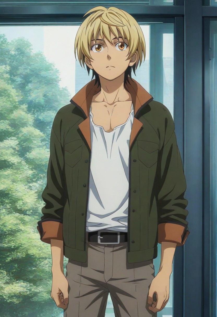 Takaki Uno, two-toned hair, orange eyes, white tank top, green jacket, rolled sleeves, belt, gray pants, knee pads