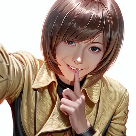 Ranru(ranru): ranru, 1girl, solo, black eyes, brown hair, bob cut, yellow dino jacket, black mini skirt, white tennis shoes, yellow dino watch