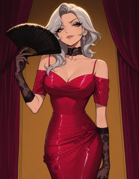 絞られたウエスト、イブニング gown、オートクチュール、シルクのドレス、ツヤのある衣装、レースの手袋、チョーカー、スパゲッティストラップ、オフショルダー、花柄プリント