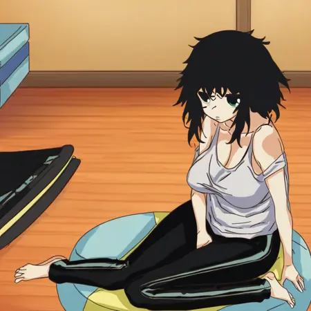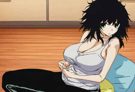 Ayukawa Tomomi,eyebag,disheveled hair, tired expression, big breast, wide hips, Green eyes, black hair,