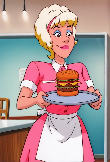 Trigger = sdaiw, Tags = 1girl, solo, blonde hair, lipstick, eyeshadow, waitress, pink hairband