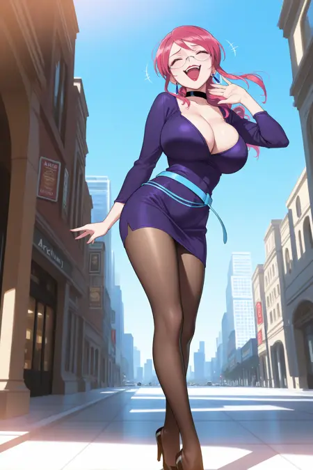 그녀의 보라색 드레스에는 "안경, 귀걸이, 보라색 드레스, 가슴 노출, 파란 벨트, 팬티스타킹"을 추가하세요.