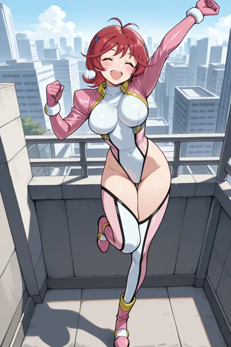 Add "hair ornament, white and pink leotard, two-tone bodysuit, pink shrug top, pink and white thighhighs, pink gloves, pink boots" for her bodysuit.