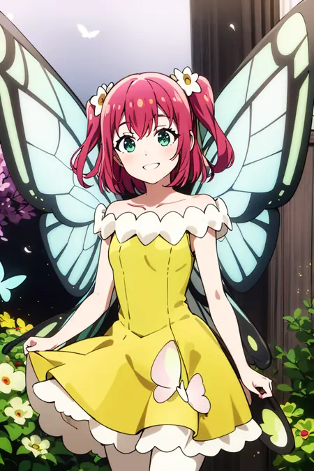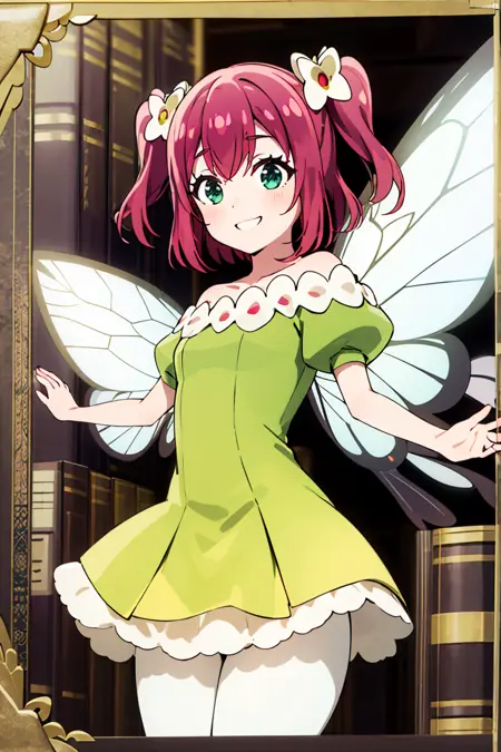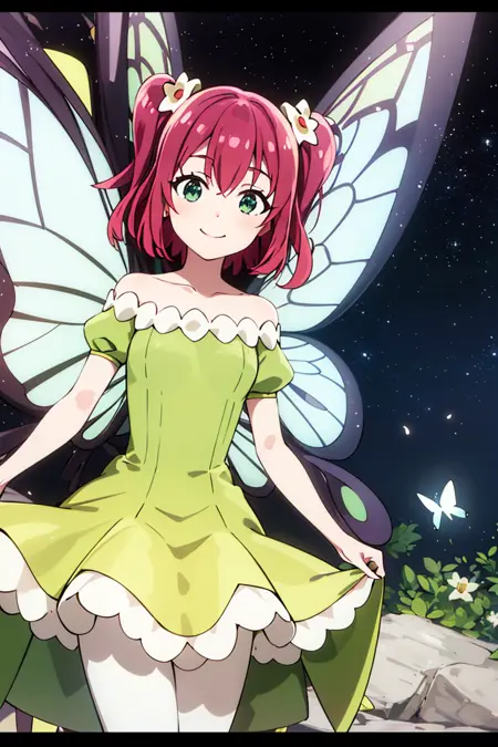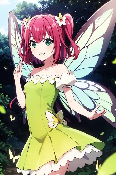 追加プロンプト: 緑のドレス、黄色のドレス、蝶の羽、妖精、