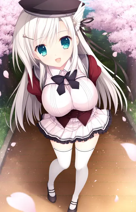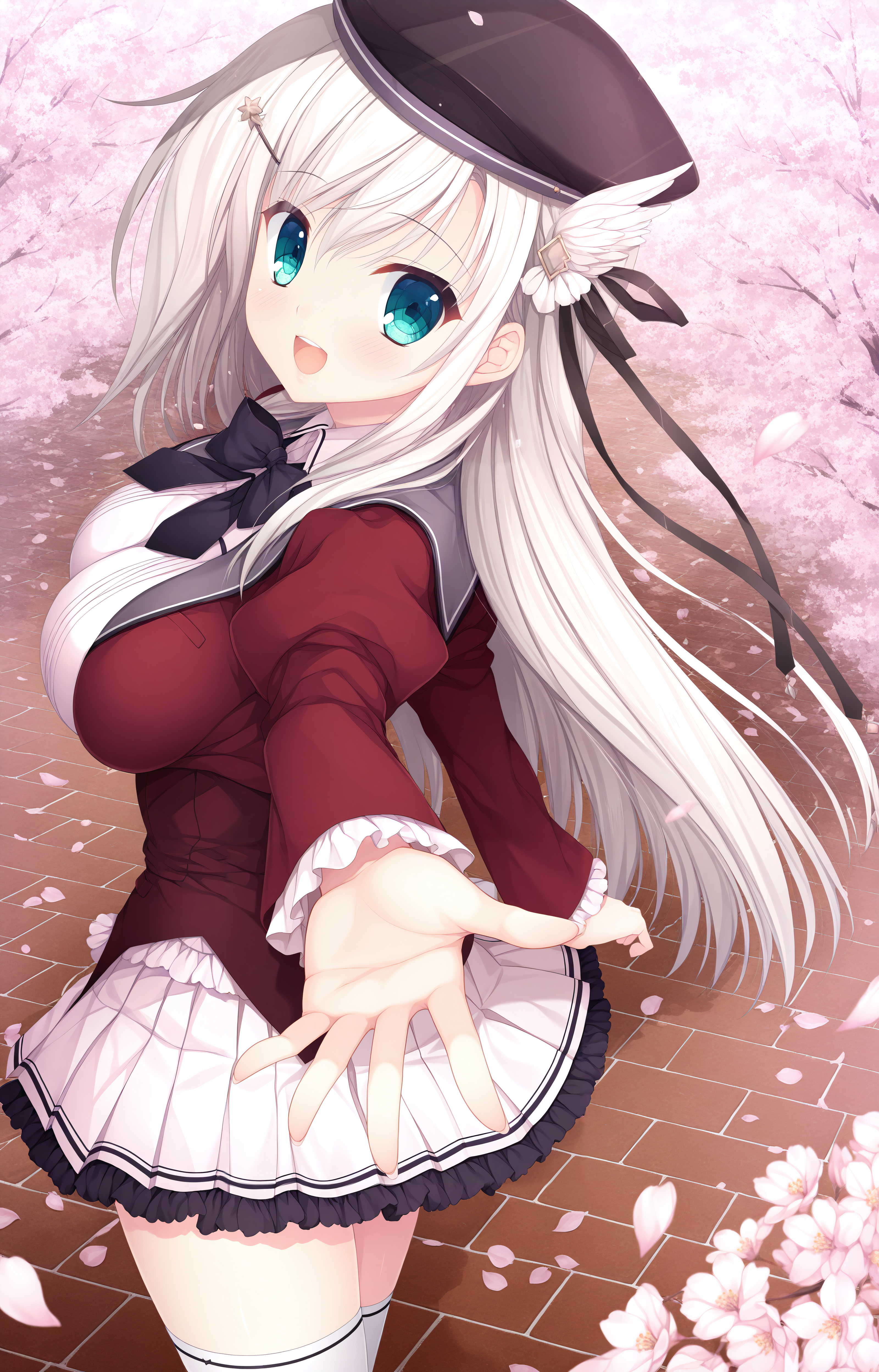 制服:1girl,erisa,1girl,过膝袜,长发,帽子,胸部,白色过膝袜,裙子,发饰,大胸部,校服, Aqua眼睛,发夹,白发,鞋子,百褶裙,长袖,玛丽珍鞋,Uniform Erisa,丝带,发带,黑色丝带,黑色荷叶边,荷叶边裙,