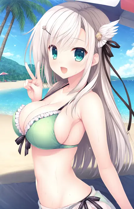 泳装:1girl,erisa,bikini_erisa,白发,长发,发饰,发带,丝带,黑色丝带,发夹,Aqua眼睛,绿眼睛,胸部,大胸部,乳沟,肚脐,泳装,比基尼,绿色比基尼,前系带上衣,透明,全身,赤足,大腿丝带,腿部丝带,胸部,