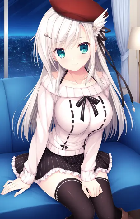 カジュアル(Casual) : 1girl, erisa, casual_erisa, white hair, long hair, hair ornament, hairclip, breasts, large breasts, hat, red beret, black ribbon, white sweater, skirt, black skirt, frilled skirt, white frills, boots, thighhighs, black thighhighs, zettai_ryouiki,aqua eyes,