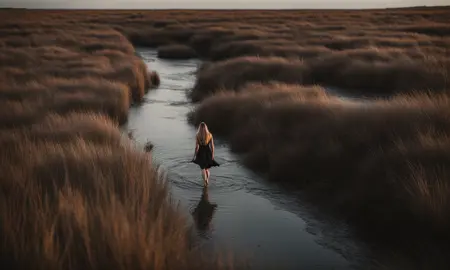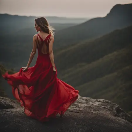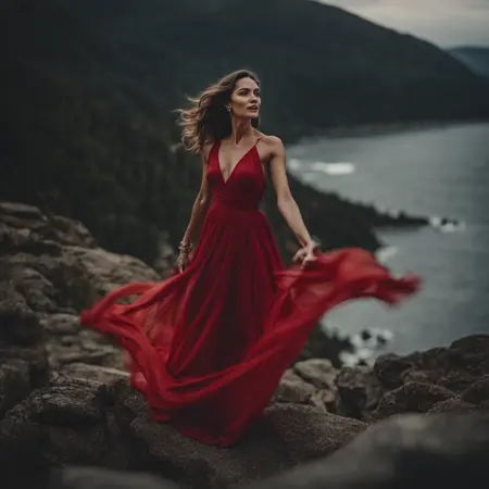 a woman standing under a cloudy blue sky with her hair blowing in the wind
