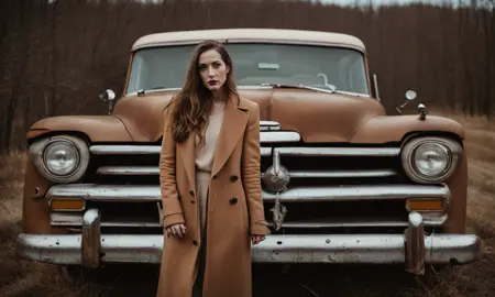 a woman with long hair and a beanie sitting in front of a pile of junk
