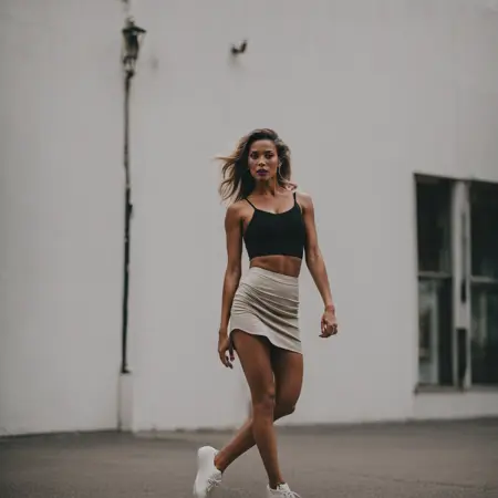 a woman in black shirt and white skirt doing a dance pose in front of a building