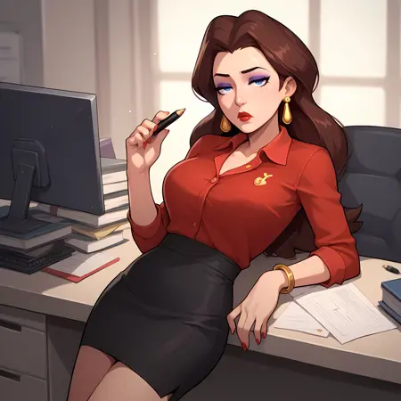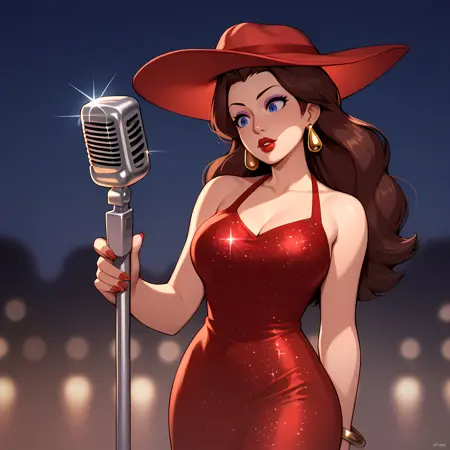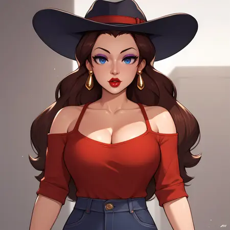 Optional: Earrings, makeup, long brown hair, hat, blue eyes, red dress