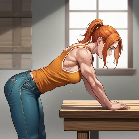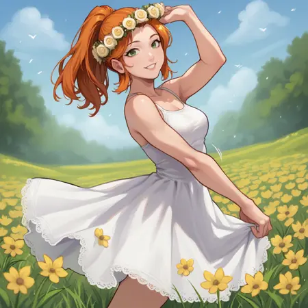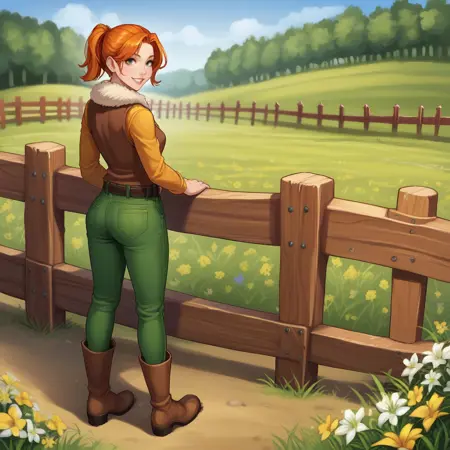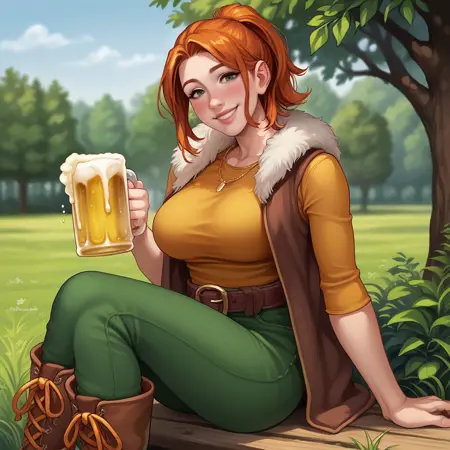 옵션: 녹색 눈, 주황색 머리, 말뚝머리, 노랑색 터틀넥, 녹색 바지, 갈색 조끼, 모피 트림
