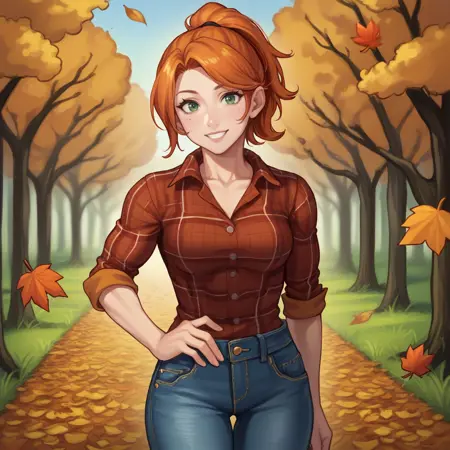 Optional: Green eyes, orange hair, ponytail, yellow turtleneck, green pants, brown vest, fur trim