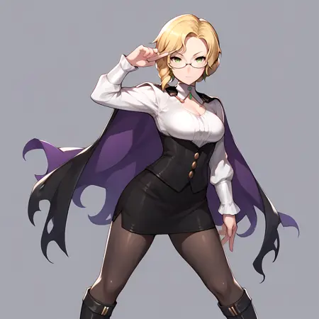可选:金色头发、绿色眼睛、白衬衫、铅笔裙、眼镜、过膝长靴、丝袜、斗篷