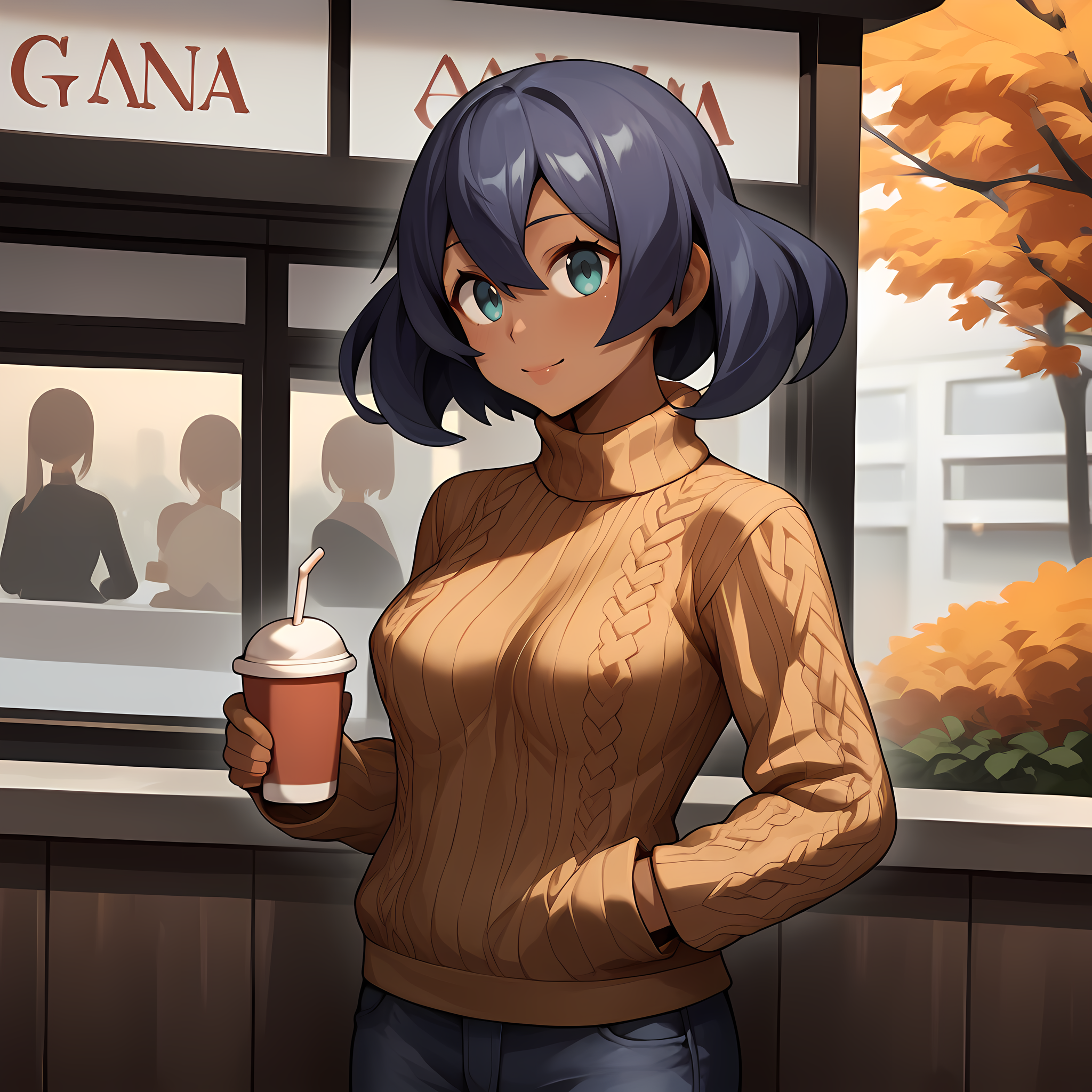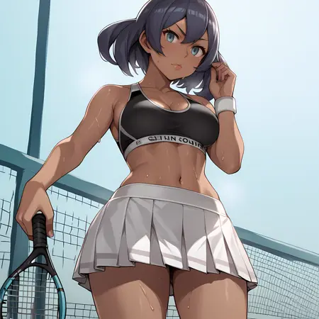 可选:深色皮肤女性,紫色头发,蓝色眼睛,白色背心,牛仔短裤,帽子,墨镜