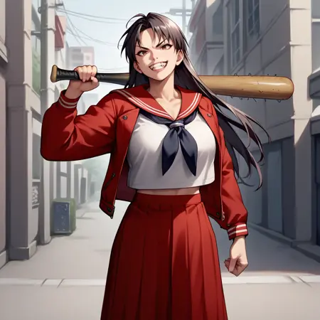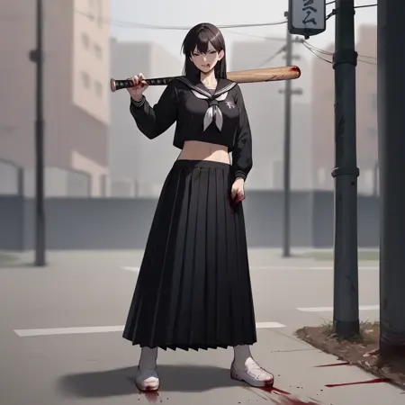 オプション:セーラー服、木刀、ロングスカート、野球 bats、へそ、血