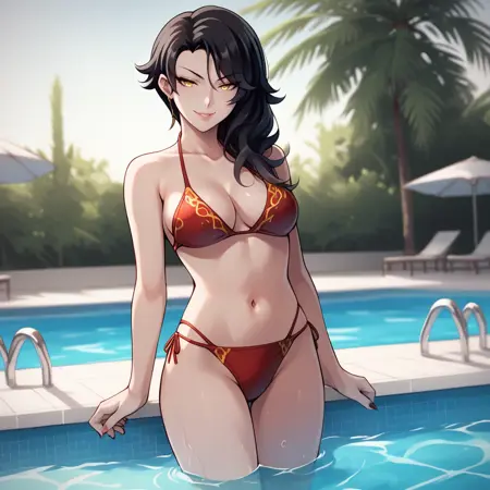 Original Outfit: Long black hair,yellow eyes, short red dress, bare shoulders, high heels, bare shoulders, choker
