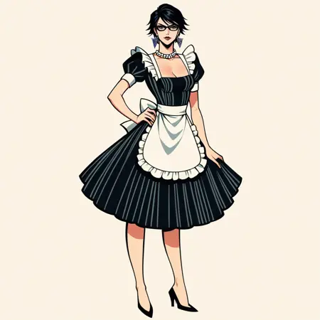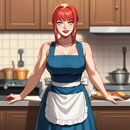 옵션: 드레스, 앞치마, 단팔, 하이힐, 진주 목걸이, 보석, 메이크업, 단발, 립스틱