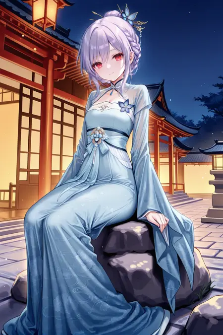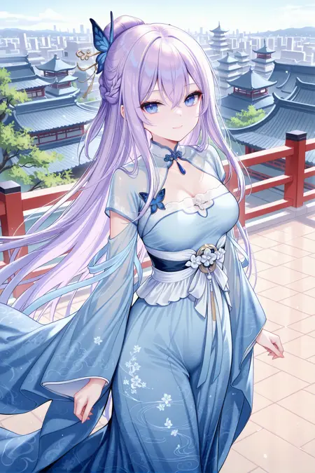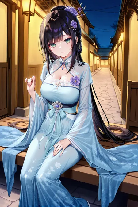 汉服,蓝色长裙,非常长的裙子,宽袖,发饰,振袖,