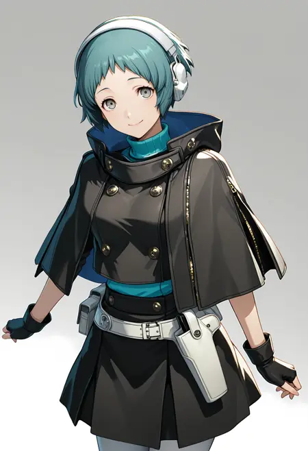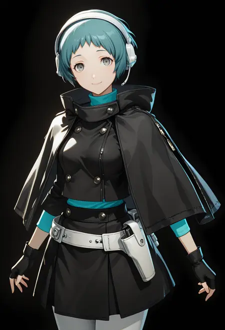 p3fuuka-sees, 흰색 헤드폰, 흰색 헤드셋, 하늘색 터틀넥, 검정 케이프, 검정 치마, 검정 가슴판, 흰색 안감, 흰색 팬티후스, 검정 지퍼 없는 장갑, 흰색 벨트, 흰색 홀스터, 지퍼, 브라스 단추,