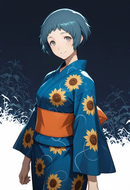 p3fuuka-yukata, 深蓝色浴衣, 向日葵图案, 橙色腰带,