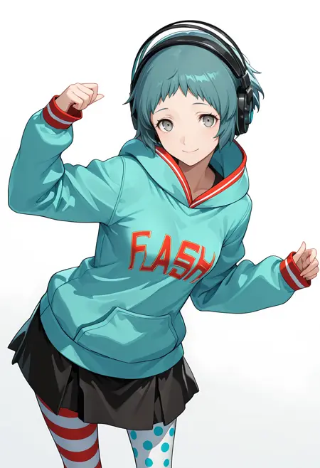p3fuuka-dance, 闪光, 水色连帽衫配红色条纹镶边, 红色袖口, 帽子放下, 黑色耳机, 白色紧身裤, 不搭配的腿部服饰, 蓝黄相间腿部服饰, 圆点图案腿部服饰, 条纹腿部服饰, 黑色短裙, 衣服未塞入,