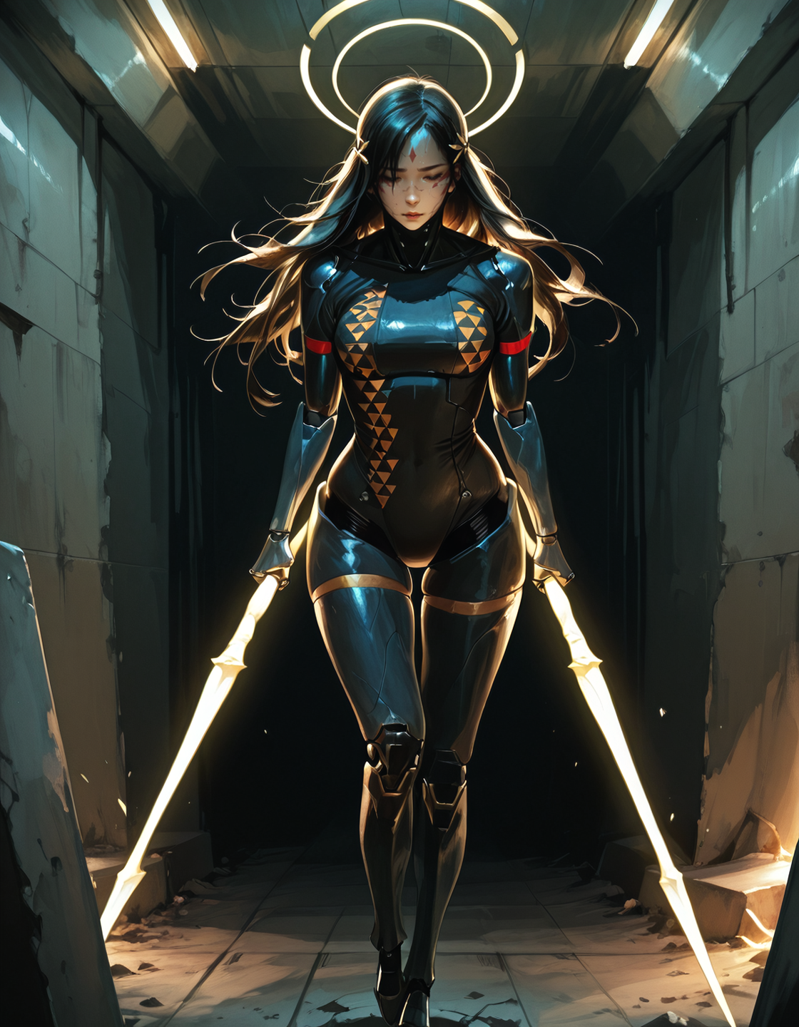 android, long hair, robot joints, black hair, facial markings, hair over one eye, blue eyes, hair ornament