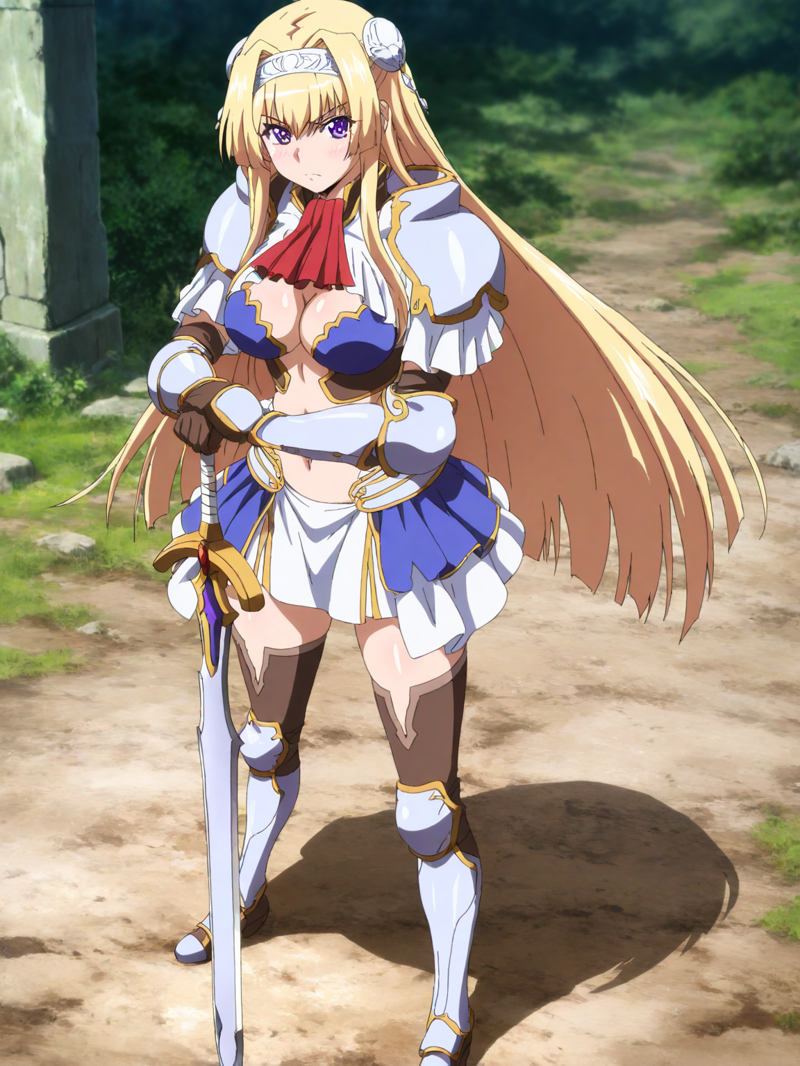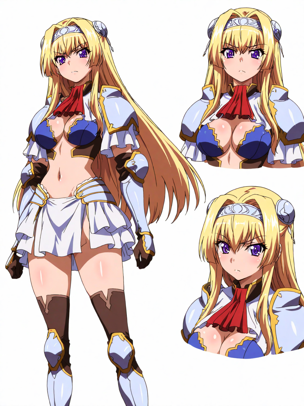 armor,cleavage,navel,red ascot,white skirt,thighhighs,knee armor boots
