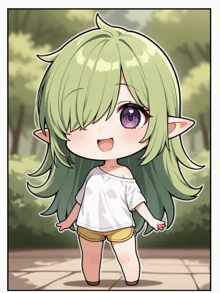 aoba, 1个女孩, 单人, 短发, 发饰, 连衣裙, 裸露肩膀, 珠宝, 紫色眼睛, 花朵, 耳环, 绿发, 赤脚, 尖耳朵, 头发上的花, 裸露腿部, 无肩带, 叶子, 无肩带连衣裙, 绿色连衣裙,