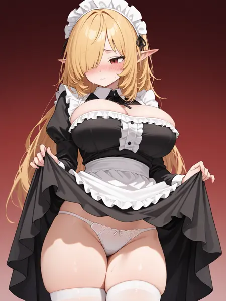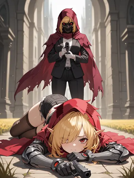 arabelle, 1girl, solo, blonde hair, red eyes, thighhighs, gloves, jacket, shorts, pointy ears, hood, cape, torn clothes, suit, cloak, hood up, hooded cape, elf