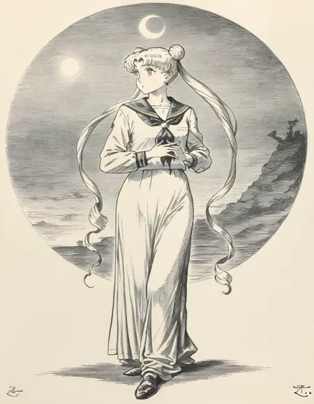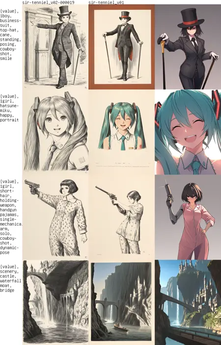 数据集中图像和标题质量更好,更具维多利亚时代风格,更多来自“印刷”的木纹效果。即使设置了“1boy”,部分基础检查点仍可能偏向女性形象。包含坦尼尔的签名。