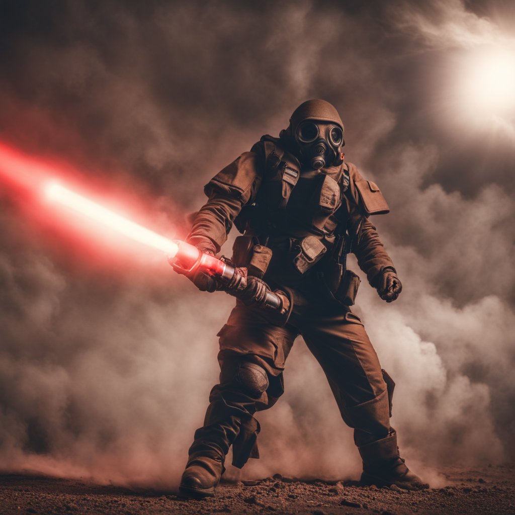 AscendentSoldiers 风格,一名戴着防毒面具的男人手持红色光剑