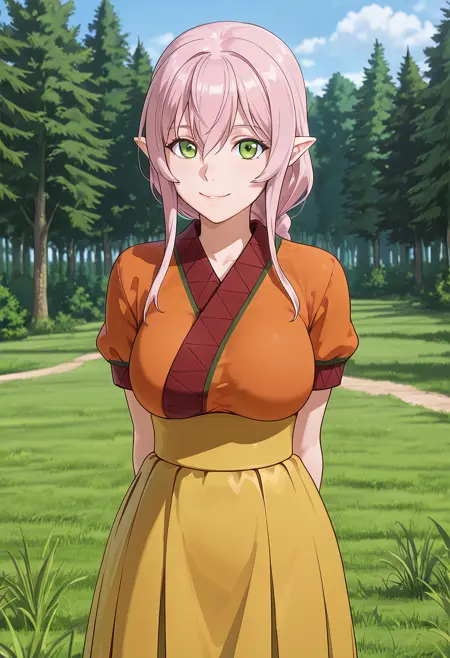 (long_hair, green_eyes, pink_hair, hair_between_eyes, braid, single_braid, pointy_ears, sidelocks,braided_ponytail:1.2),