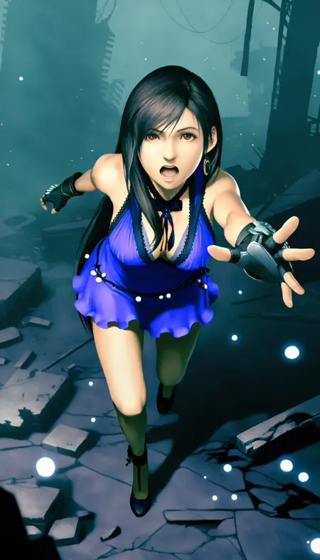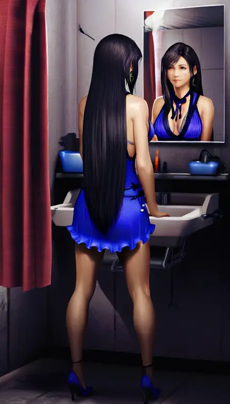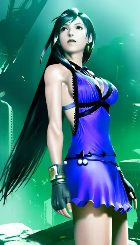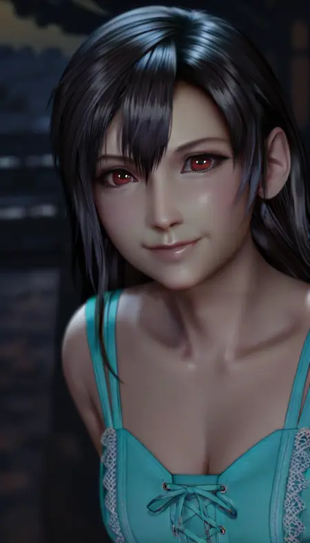 rebirthtifalockhart, realistic, 1girl, solo, black hair, bangs, long hair, red eyes, cyan dress, cyan strappy sandals,