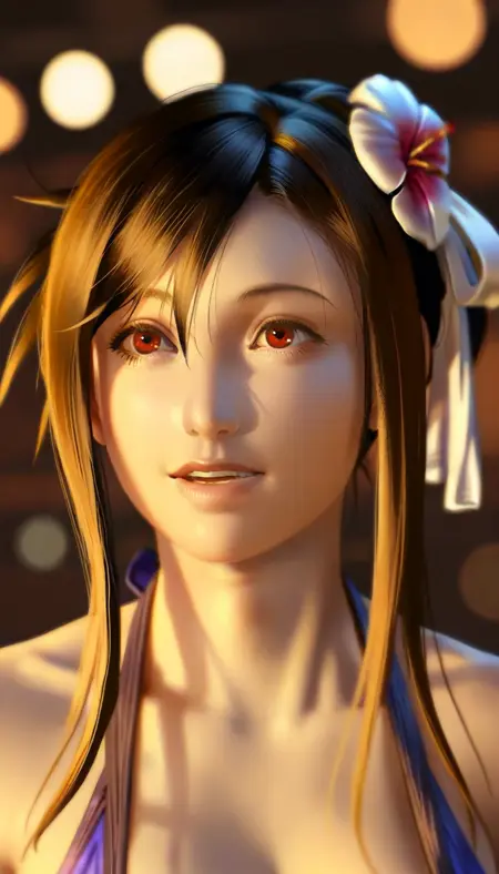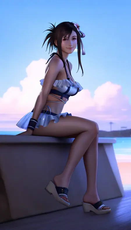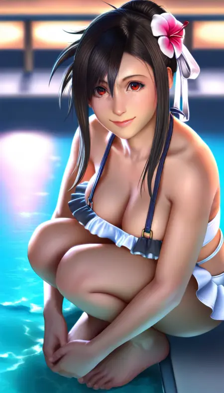 rebirthtifalockhart, realistic, 1girl, solo, black hair, bangs, loose updo, hair ornament, red eyes, crop top, swimming skirt, grey sandals,