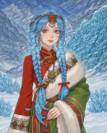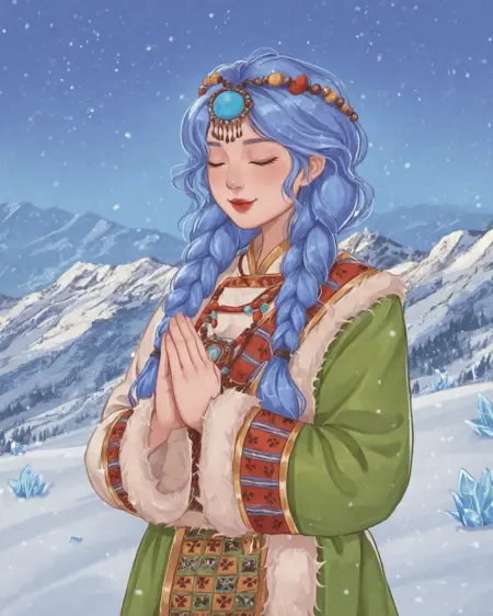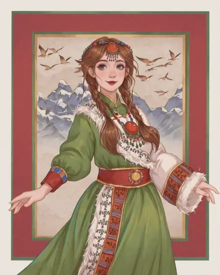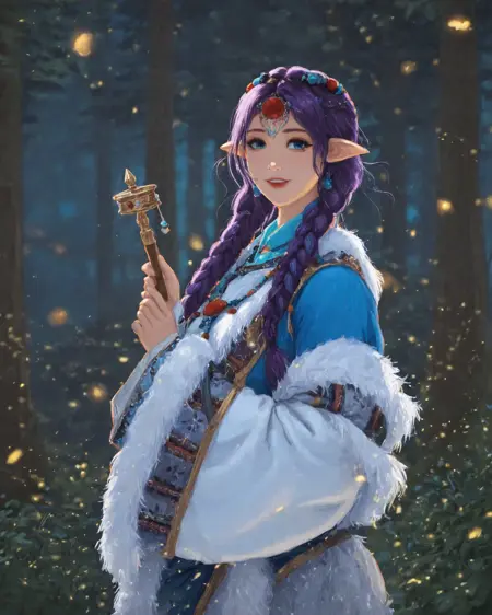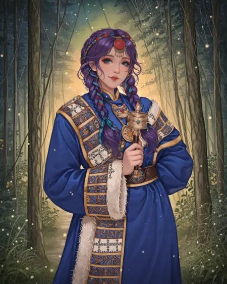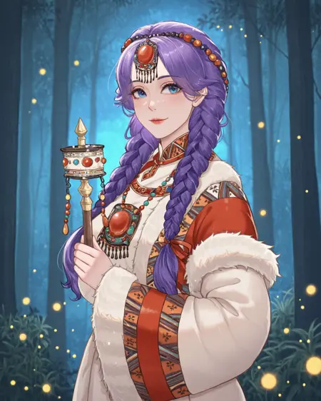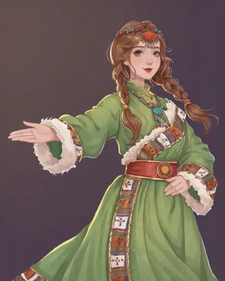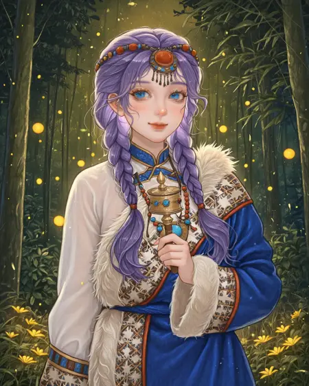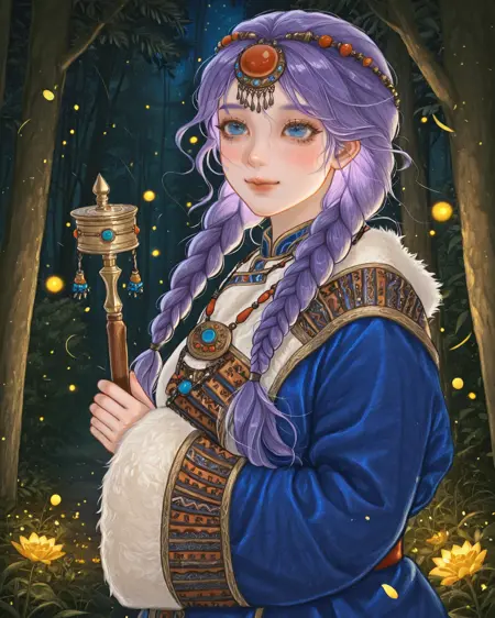 它能绘制出服饰以及传统的藏族转经筒(你常在服饰旁看到的手持物品)。要使用它,请使用触发词“holding tibetfa prayer wand”。