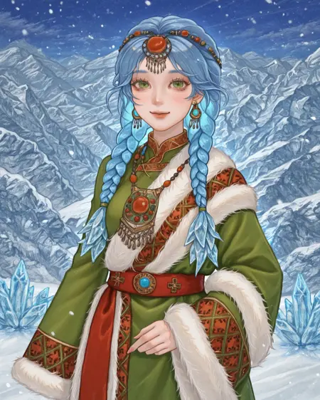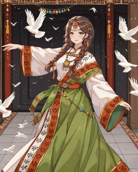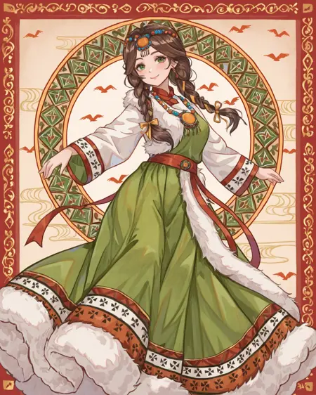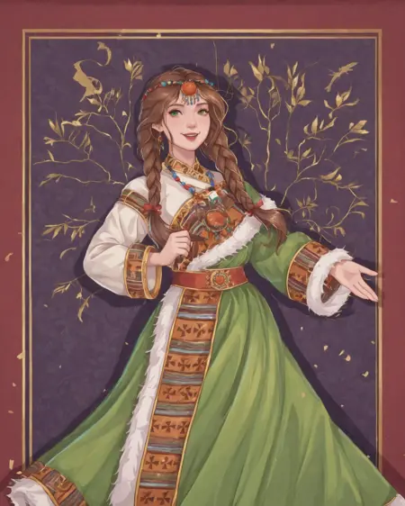 传统服饰的一部分是编入发辫的彩带,但似乎它没有很好地捕捉到这一点。“braid with ribbons”似乎能稍微改善一点。无论如何,这确实是训练数据的一部分,所以如果你找到了合适的检查点或风格LoRA,它可能会神奇地出现。