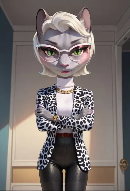 | 训练词汇 | grey fur, white hair, short hair, cat eyes, green eyes, eyelashes, cat ears, cat nose, small nose, long tail, four fingers on arms, pink nails, pink lips已复制! glasses, white sweater, white jacket with black spots, red belt, black leggings, grey boots, gold bracelet on right hand, gold watch on left hand, gold necklace已复制! |