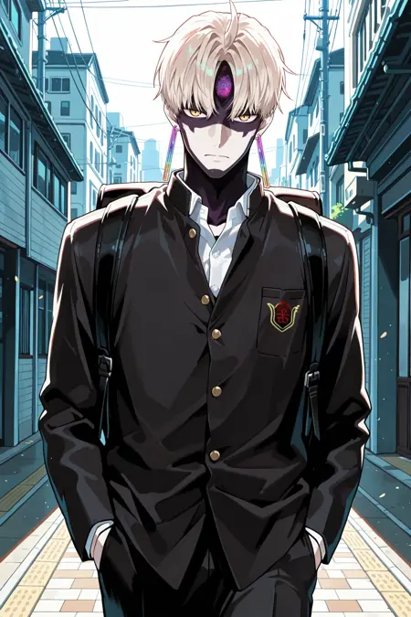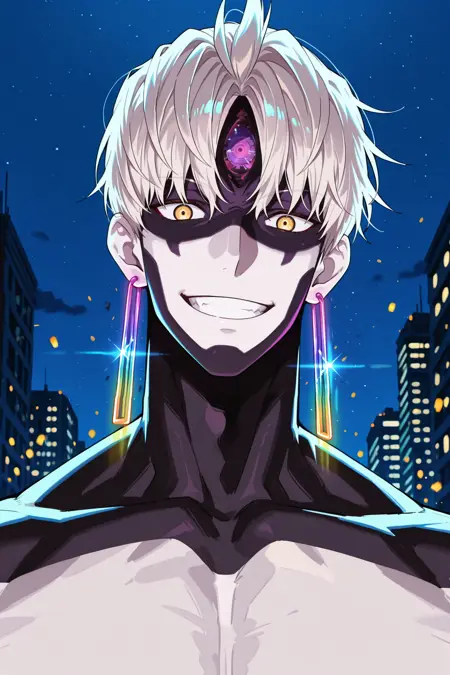 evileye, evil_eye_yokai, platinum blonde hair, yellow eyes, short hair, iridescent earrings, facial mark, pale_skin, forehead_symbol, black tattoo