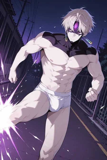 evileye, evil_eye_yokai, platinum blonde hair, yellow eyes, short hair, iridescent earrings, facial mark, pale_skin, forehead_symbol, black tattoo