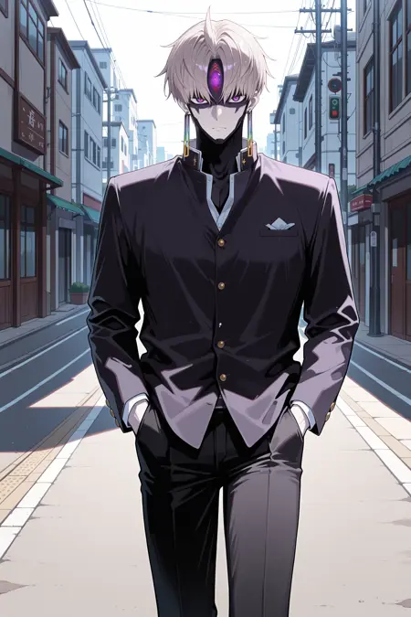 evileye, evil_eye_yokai, platinum blonde hair, purple eyes, iridescent earrings, facial mark, pale skin, forehead symbol, black neck and shoulder tattoo