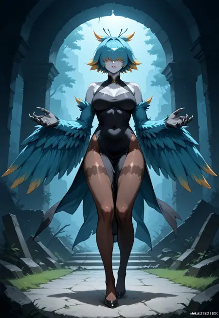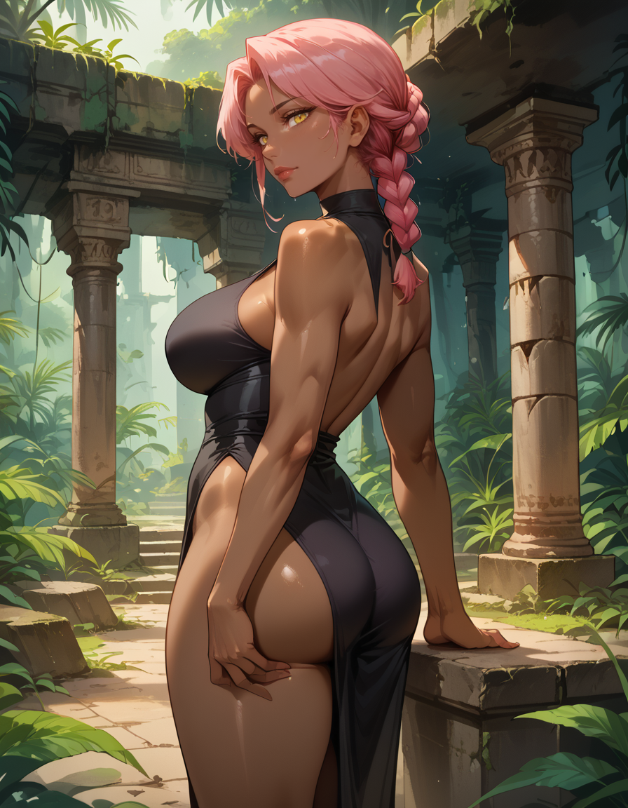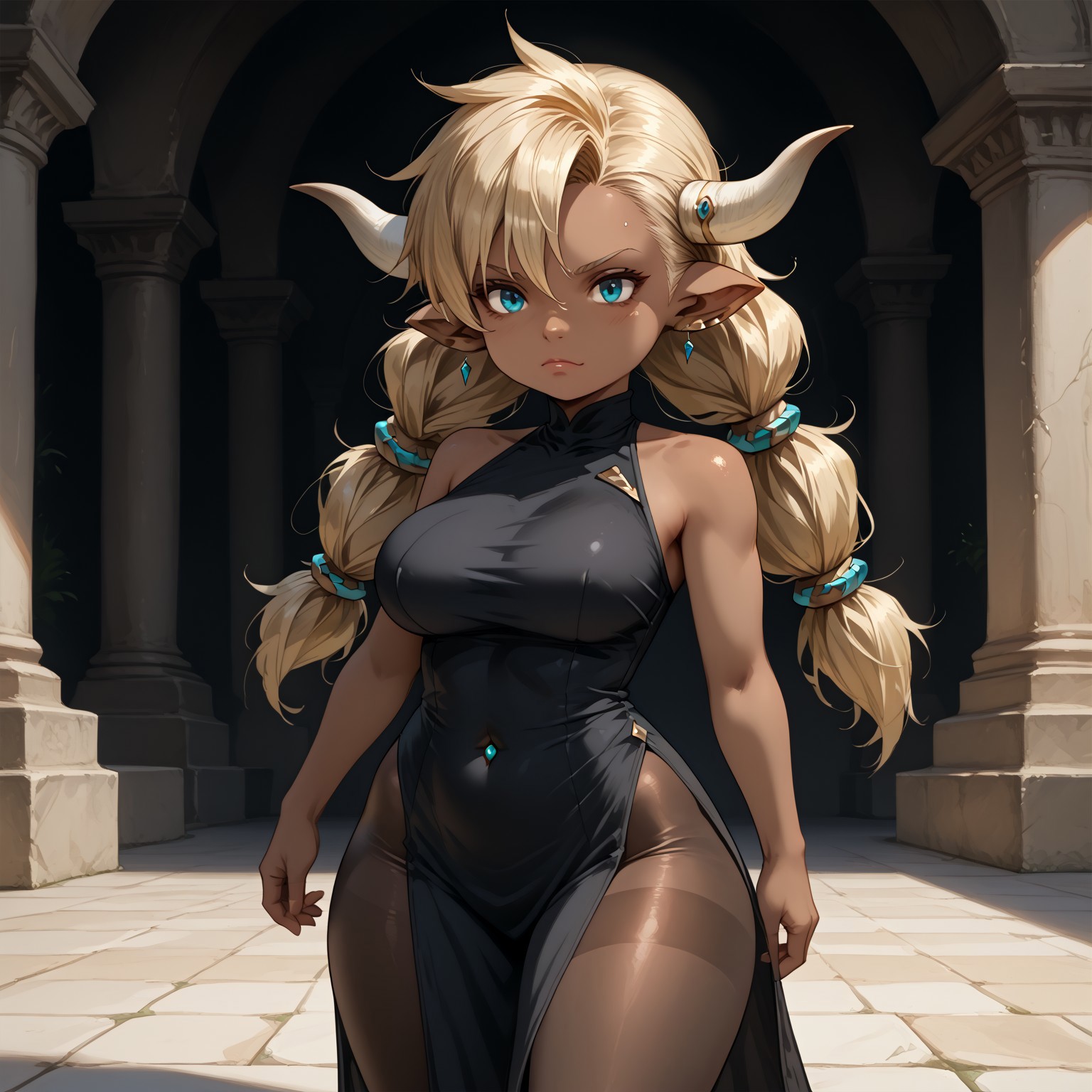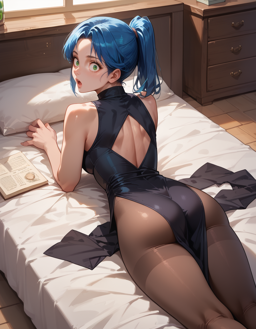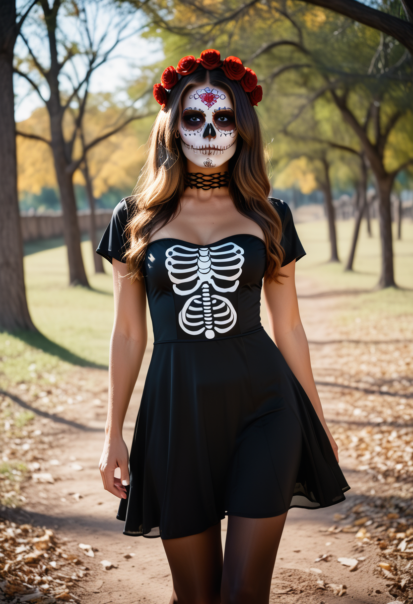 You can generate the model with either just the dress or with brown pantyhose using the following keywords: