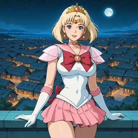 白い胸アーマー付きレオタード、三つの白い肩パッド、マジェラン(ピンク)セーラー襟、三本の白いストライプ、マジェラン(ピンク)プリーツスカート、白いふわふわベルト、セーラー戦士ユニフォーム、白い手袋、肘の下に三つのピンクのアームフィッティング、額にピンクの卵形の石が付いたゴールデンのティアラ、ピンクのチョーカー、チョーカーの中心にピンクの卵形の石、ダイナミックなポーズ、額のゴールデンティアラ、ピンクの円形の石、前面の通常のピンクのリボン、背面の通常のピンクのリボン、マジェラン(ピンク)ハイヒールシューズ、三本の白いストライプが入った三日月型のイヤリング、背面のピンクリボン、ピンクのハイヒールシューズ、三日月型のイヤリング、