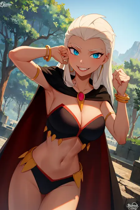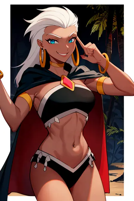 Extra prompts: cape, dark skin, long white hair, black crop top,