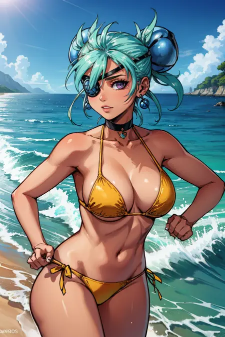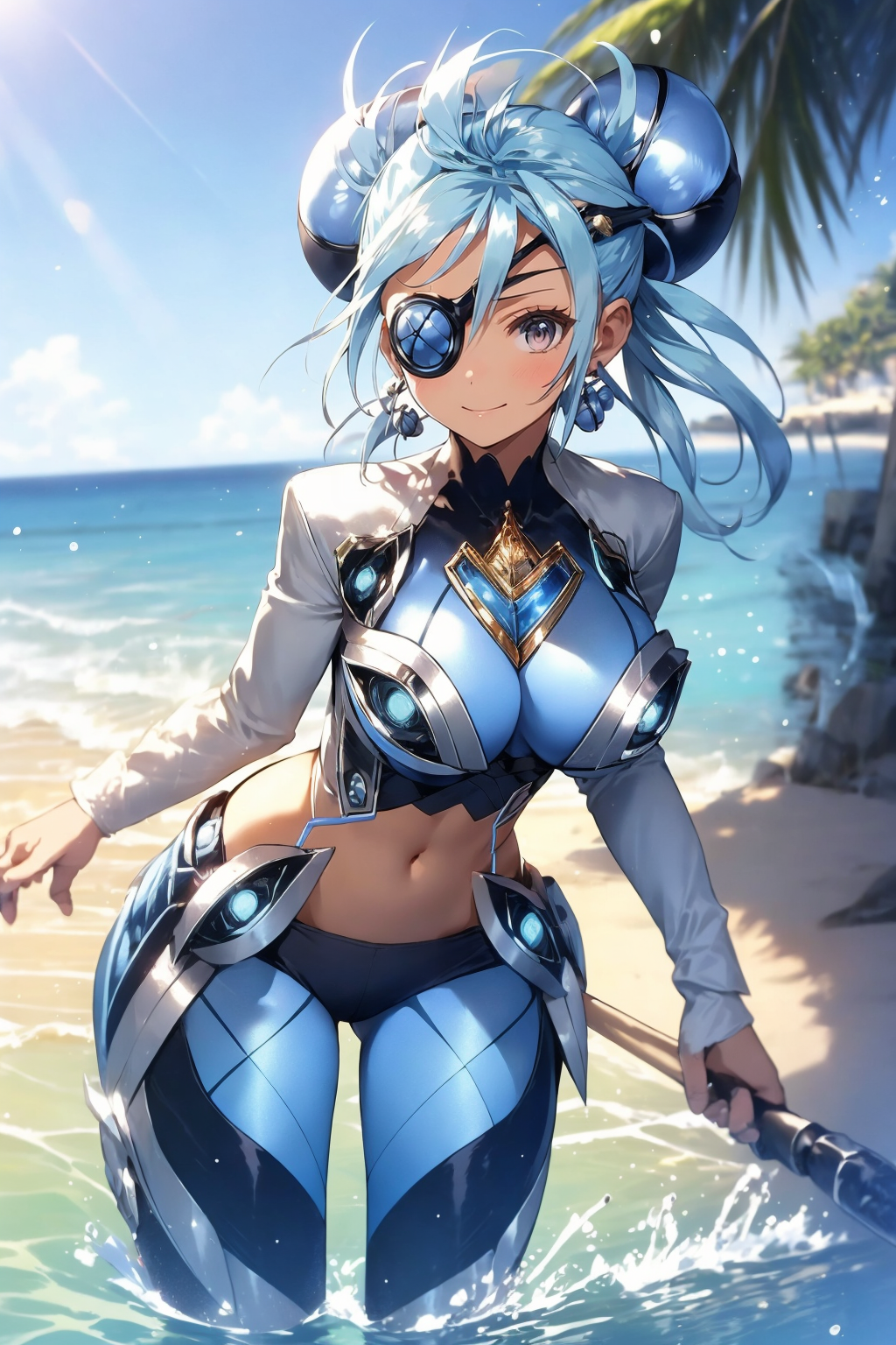 为获得她的典型外观,请添加 "眼罩、耳环、发饰、蓝色紧身衣、露腹"。